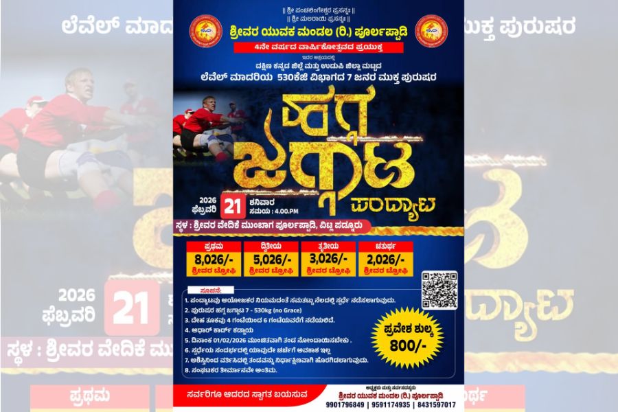 ಬಂಟ್ವಾಳ: ಪೂರ್ಲಪ್ಪಾಡಿಯ ಶ್ರೀವರ ಯುವಕ ಮಂಡಲದ ನಾಲ್ಕನೇ ವಾರ್ಷಿಕೋತ್ಸವದ ಪ್ರಯುಕ್ತ ಫೆ.21 ರಂದು ಅವಳಿ ಜಿಲ್ಲೆಗಳಾದ ದಕ್ಷಿಣ ಕನ್ನಡ ಮತ್ತು ಉಡುಪಿ ಜಿಲ್ಲಾ ಮಟ್ಟದ ಲೆವೆಲ್ ಮಾದರಿಯ 530 ಕೆಜಿ ವಿಭಾಗದ 7 ಜನರ ಮುಕ್ತ ಪುರುಷರ ಹಗ್ಗ ಜಗ್ಗಾಟ ಪಂದ್ಯಾಟ ಆಯೋಜಿಸಲಾಗಿದೆ.