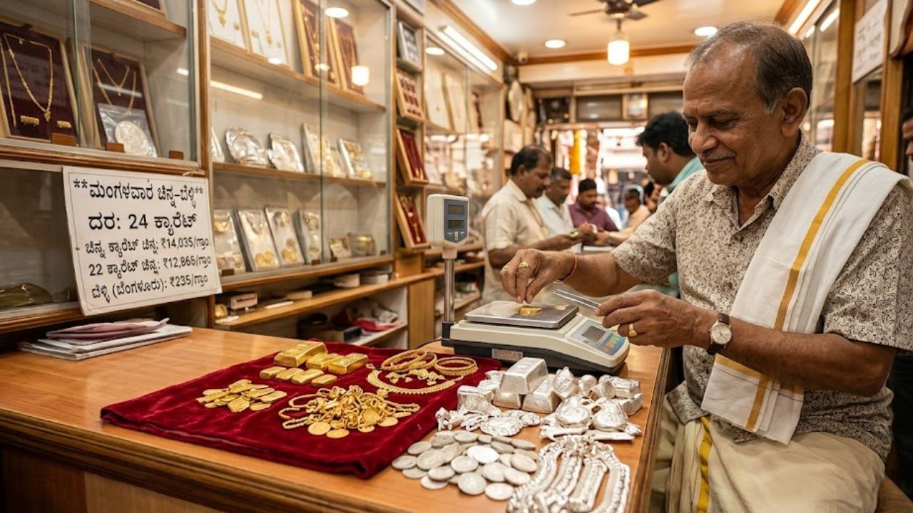 ಬೆಂಗಳೂರು: ಇಂದು ಮಂಗಳವಾರದ ವಹಿವಾಟಿನಲ್ಲಿ ಚಿನ್ನದ ಪ್ರಿಯರಿಗೆ ತುಸು ಸಮಾಧಾನದ ಸುದ್ದಿ ಸಿಕ್ಕಿದೆ. ಅಂತರಾಷ್ಟ್ರೀಯ ಮಾರುಕಟ್ಟೆಯ ಏರಿಳಿತಗಳ ನಡುವೆ ಚಿನ್ನದ ಬೆಲೆಯಲ್ಲಿ ಇಳಿಕೆ ಕಂಡುಬಂದಿದ್ದರೆ, ಬೆಳ್ಳಿಯ ಬೆಲೆಯು ಪ್ರತಿ ಗ್ರಾಂಗೆ 5 ರೂಪಾಯಿಯಷ್ಟು ಏರಿಕೆಯಾಗಿದೆ.