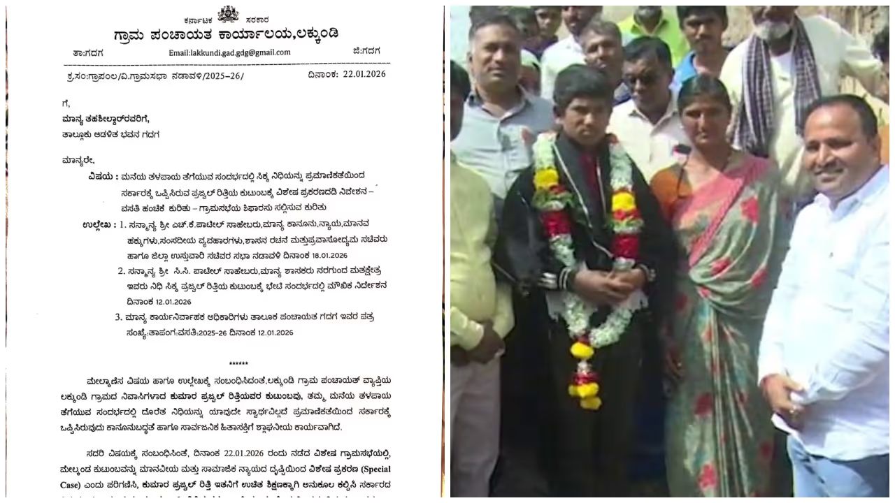 ಗದಗ: ಗದಗ ಜಿಲ್ಲೆಯ ಐತಿಹಾಸಿಕ ಲಕ್ಕುಂಡಿ ಗ್ರಾಮದಲ್ಲಿ ಮನೆ ಪಾಯ ಅಗೆಯುವಾಗ ಸಿಕ್ಕ ಅಪಾರ ಮೌಲ್ಯದ ಚಿನ್ನದ ನಿಧಿಯನ್ನು ಪ್ರಾಮಾಣಿಕವಾಗಿ ಸರ್ಕಾರಕ್ಕೆ ಒಪ್ಪಿಸಿದ್ದ ಬಾಲಕ ಪ್ರಜ್ವಲ್ ರಿತ್ತಿಗೆ ಈಗ ಸರ್ಕಾರದ ವತಿಯಿಂದ ಬಂಪರ್ ಗಿಫ್ಟ್ ಸಿಕ್ಕಿದೆ. ಪ್ರಜ್ವಲ್ನ ಈ ಪ್ರಾಮಾಣಿಕ ಕಾರ್ಯವನ್ನು ಮೆಚ್ಚಿ ರಾಜ್ಯ ಸರ್ಕಾರವು ಆತನ ಕುಟುಂಬಕ್ಕೆ ನಿವೇಶನ (Site) ನೀಡುವುದಾಗಿ ಘೋಷಿಸಿದೆ. ಜನವರಿ 10, 2026 ರಂದು ಪ್ರಜ್ವಲ್ ರಿತ್ತಿ ತನ್ನ ಹಳೆಯ ಮನೆಯನ್ನು ಕೆಡವಿ ಹೊಸ ಮನೆ ನಿರ್ಮಿಸಲು ಪಾಯ ಅಗೆಯುತ್ತಿದ್ದಾಗ ಸುಮಾರು 470 ರಿಂದ 520 ಗ್ರಾಂ ತೂಕದ ಪುರಾತನ ಚಿನ್ನಾಭರಣಗಳು ಮತ್ತು ನಾಣ್ಯಗಳಿದ್ದ ತಾಮ್ರದ ಬಿಂದಿಗೆ ಪತ್ತೆಯಾಗಿತ್ತು.