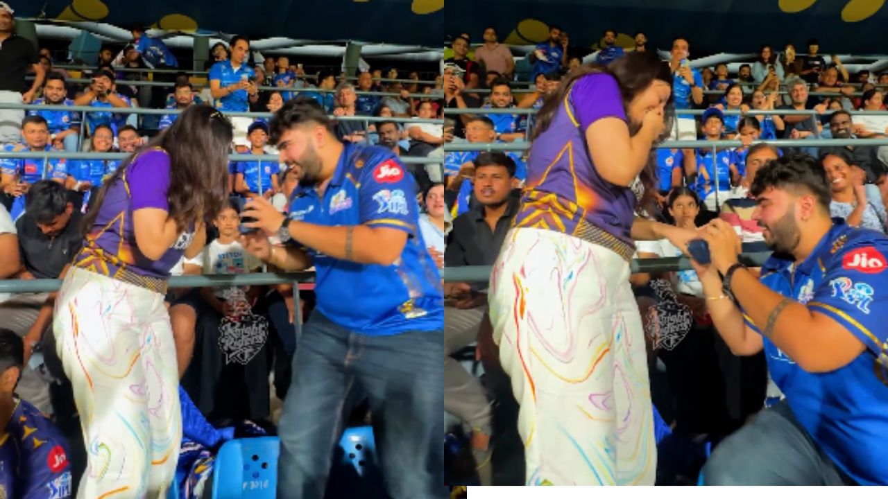 ಪಂದ್ಯ ನಡೆಯುತ್ತಿದ್ದಾಗ ಮುಂಬೈ ಇಂಡಿಯನ್ಸ್ (MI) ತಂಡದ ಜೆರ್ಸಿ ಧರಿಸಿದ್ದ ಯುವಕನೊಬ್ಬ, ಕೋಲ್ಕತ್ತಾ ನೈಟ್ ರೈಡರ್ಸ್ (KKR) ತಂಡದ ಅಭಿಮಾನಿಯಾಗಿದ್ದ ತನ್ನ ಗೆಳತಿಗೆ ಮೈದಾನದಲ್ಲೇ ಉಂಗುರ ತೊಡಿಸಿ ಪ್ರಪೋಸ್ ಮಾಡಿದ್ದಾನೆ. ಅನಿರೀಕ್ಷಿತ ಈ ನಡೆಯಿಂದ ಯುವತಿ ಮೊದಲು ಶಾಕ್ ಆದರೂ, ನಂತರ ಭಾವುಕರಾಗಿ ಪ್ರೀತಿಯನ್ನು ಒಪ್ಪಿಕೊಂಡರು.
