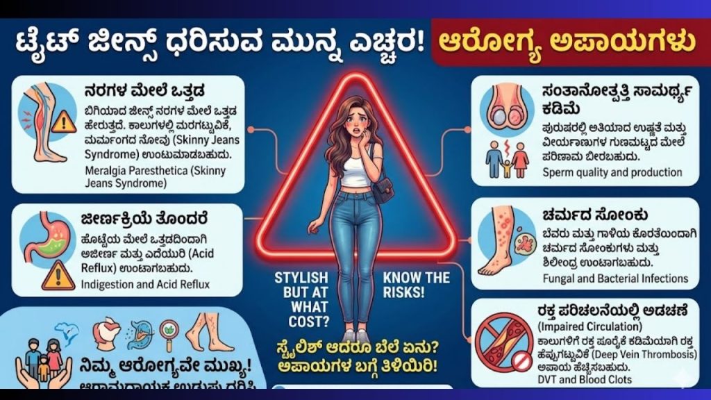 ಅತಿಯಾದ ಬಿಗಿಯಾದ ಜೀನ್ಸ್ ಧರಿಸುವುದರಿಂದ ಸೊಂಟ ಮತ್ತು ತೊಡೆಯ ಭಾಗದ ನರಗಳ ಮೇಲೆ ವಿಪರೀತ ಒತ್ತಡ ಬೀಳುತ್ತದೆ. ಇದರಿಂದ ಕಾಲುಗಳಲ್ಲಿ ಮರಗಟ್ಟುವಿಕೆ, ಜುಮುಗುಟ್ಟುವಿಕೆ ಮತ್ತು ಅತೀವ ನೋವು ಕಾಣಿಸಿಕೊಳ್ಳಬಹುದು. ಇದನ್ನು ವೈದ್ಯಕೀಯ ಭಾಷೆಯಲ್ಲಿ ‘ಮೆರಾಲ್ಜಿಯಾ ಪ್ಯಾರೆಸ್ತಟಿಕಾ’ (Meralgia Paresthetica) ಎಂದು ಕರೆಯಲಾಗುತ್ತದೆ.
