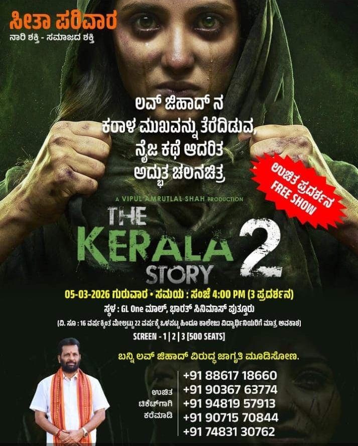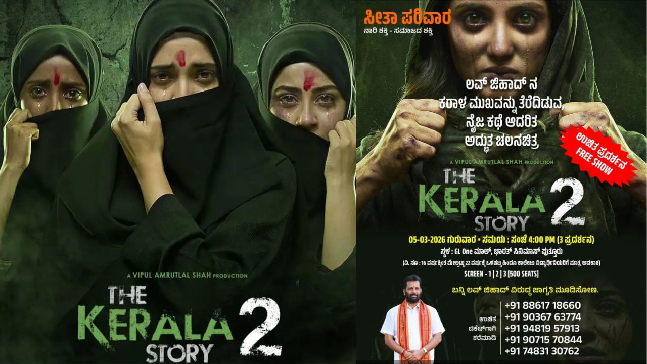 ಪುತ್ತೂರು: ‘ಲವ್ ಜಿಹಾದ್’ ಕರಾಳ ಮುಖವನ್ನು ತೆರೆದಿಡುವ ನೈಜ ಕಥೆ ಆಧಾರಿತ ಎನ್ನಲಾದ ‘ದಿ ಕೇರಳ ಸ್ಟೋರಿ-2’ ಚಲನಚಿತ್ರದ ಉಚಿತ ಪ್ರದರ್ಶನವನ್ನು ಪುತ್ತೂರಿನಲ್ಲಿ ಆಯೋಜಿಸಲಾಗಿದೆ. ‘ಸೀತಾ ಪರಿವಾರ’ ಸಂಘಟನೆಯ ವತಿಯಿಂದ ಈ ವಿಶೇಷ ಪ್ರದರ್ಶನ ಏರ್ಪಡಿಸಲಾಗಿದೆ.