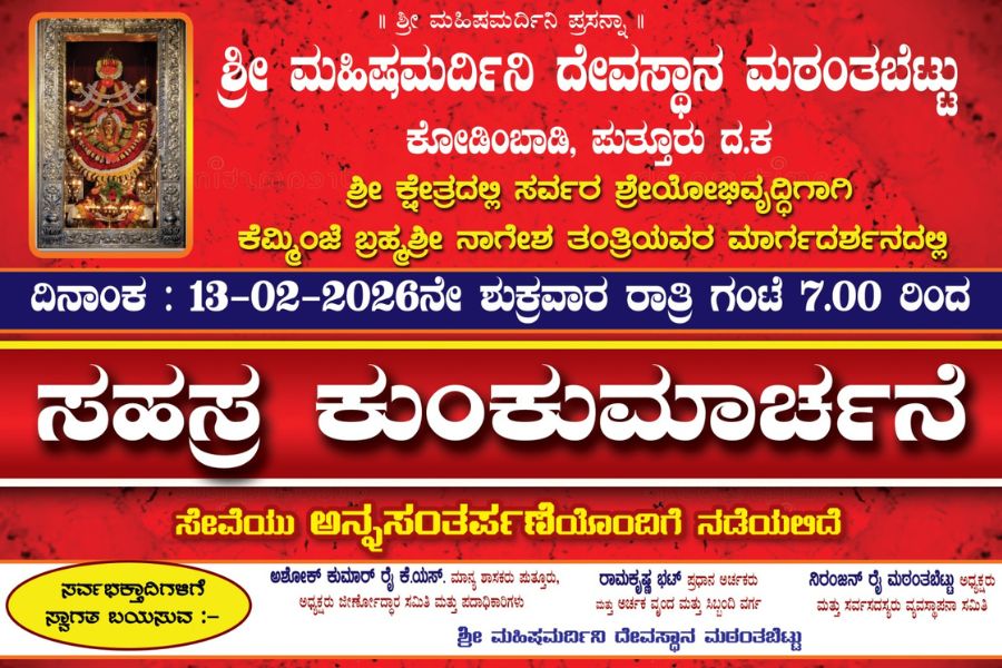 ಪುತ್ತೂರು: ಕೋಡಿಂಬಾಡಿ ಮಠoತಬೆಟ್ಟು ಶ್ರೀ ಮಹಿಷಮರ್ಧಿನಿ ದೇವಸ್ಥಾನದಲ್ಲಿ ನಾಳೆ (ಫೆ.13) ರಾತ್ರಿ 7.ಗಂಟೆಯಿಂದ ಸಹಸ್ರ ಕುಂಕುಮಾರ್ಚನೆ ಸೇವೆಯು ನಡೆಯಲಿದೆ.