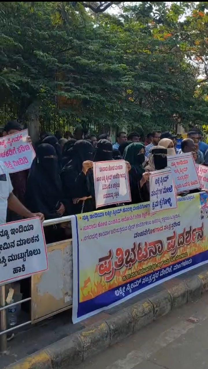 ಮಂಗಳೂರು : ನ್ಯೂ ಇಂಡಿಯಾ ಸ್ಕೀಂ ಹೆಸರಿನಲ್ಲಿ ಸಾವಿರಾರು ಮಂದಿಗೆ ನೂರಾರು ಕೋಟಿ ವಂಚಿಸಿದ ಪ್ರಕರಣ ಸಂಬಂಧ ಹಣ ಕಳೆಂದುಕೊಂಡ ಸಂತ್ರಸ್ತರು ಇಂದು ಮಂಗಳೂರಿನ ಟವರ್ ಕ್ಲಾಕ್ ಮುಂಭಾಗ ಪ್ರತಿಭಟನೆ ನಡೆಸಿ ಆಕ್ರೋಶ ಹೊರಹಾಕಿದರು. ಜನರನ್ನು ವಂಚಿಸಿದ ನ್ಯೂ ಇಂಡಿಯಾ ಲಕ್ಕಿ ಸ್ಕೀಂನ ಎಂಡಿ ಅಶ್ರಫ್ ಮತ್ತು ಮ್ಯಾನೇಜರ್ ಹನೀಫ್ ಅವರ ವಿರುದ್ಧ ಕ್ರಮ ಕೈಗೊಳ್ಳಬೇಕು. ವಂಚನೆಗೊಳಗಾದ ಜನರಿಗೆ ನ್ಯಾಯ ಒದಗಿಸಿಕೊಡಬೇಕು ಹಾಗೂ ನಗರದಲ್ಲಿ ಕಾರ್ಯನಿರ್ವಹಿಸುತ್ತಿರುವ ಬ್ಲೇಡ್ ಕಂಪನಿಗಳಿಂದ ಜನರನ್ನು ರಕ್ಷಿಸುವಂತೆ ಒತ್ತಾಯಿಸಿ ಮಂಗಳೂರು ಲಕ್ಕಿ ಸ್ಕೀಂ ಸಂತ್ರಸ್ತರ ವೇದಿಕೆಯು ಪ್ರತಿಭಟನೆ ನಡೆಸಿತು.