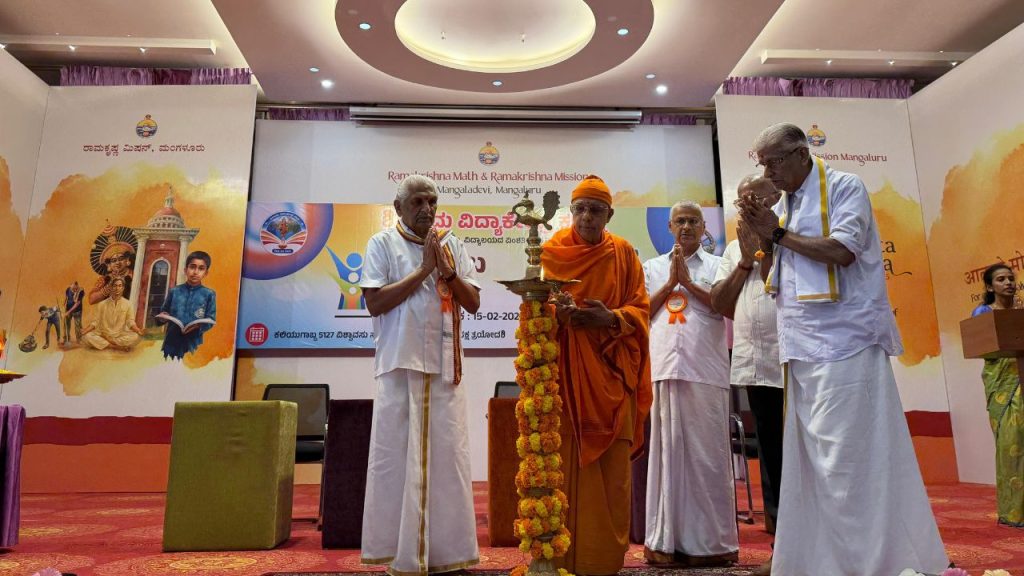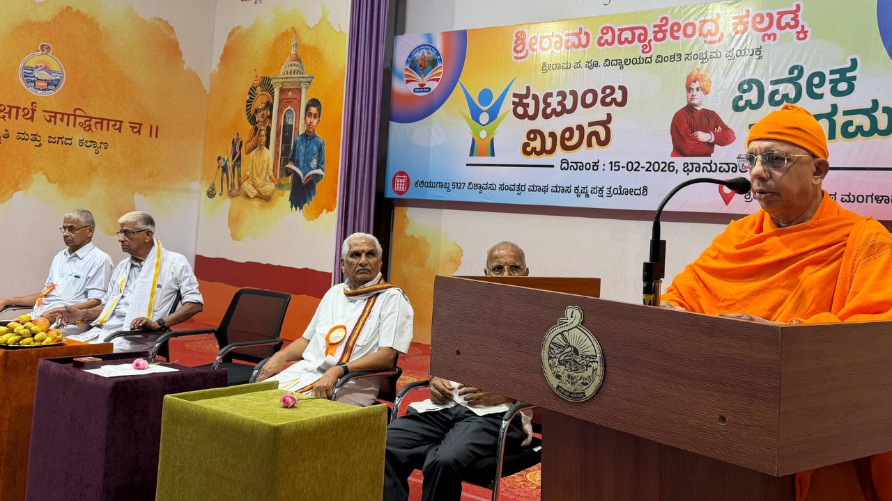 ಮಂಗಳೂರು: ಶ್ರೀರಾಮ ವಿದ್ಯಾಕೇಂದ್ರ ಮತ್ತು ಶ್ರೀರಾಮ ಪದವಿಪೂರ್ವ ವಿದ್ಯಾಲಯದ ವಿಂಶತಿ ಸಂಭ್ರಮದ ಅಂಗವಾಗಿ ‘ಕುಟುಂಬ ಮಿಲನ – ವಿವೇಕ ಸಂಗಮ’ ಕಾರ್ಯಕ್ರಮವು ಫೆಬ್ರವರಿ 15, 2026ರಂದು ಮಂಗಳಾದೇವಿಯ ಶ್ರೀ ರಾಮಕೃಷ್ಣ ಮಠದಲ್ಲಿ ಅತ್ಯಂತ ಅರ್ಥಪೂರ್ಣವಾಗಿ ಜರುಗಿತು. ಮಂಗಳೂರು ಶ್ರೀ ರಾಮಕೃಷ್ಣ ಮಠದ ಅಧ್ಯಕ್ಷರಾದ ಸ್ವಾಮಿ ಜಿತಕಾಮಾನಂದಜಿ ಅವರು ದೀಪ ಪ್ರಜ್ವಲಿಸಿ ಕಾರ್ಯಕ್ರಮ ಉದ್ಘಾಟಿಸಿದರು. ನಂತರ ಮಾತನಾಡಿದ ಅವರು, ಕೌಟುಂಬಿಕ ಜೀವನದಲ್ಲಿ ಆಧ್ಯಾತ್ಮಿಕತೆಯನ್ನು ಮೈಗೂಡಿಸಿಕೊಂಡು ಮುನ್ನಡೆಯುವಂತೆ ಕರೆ ನೀಡಿದರು.
